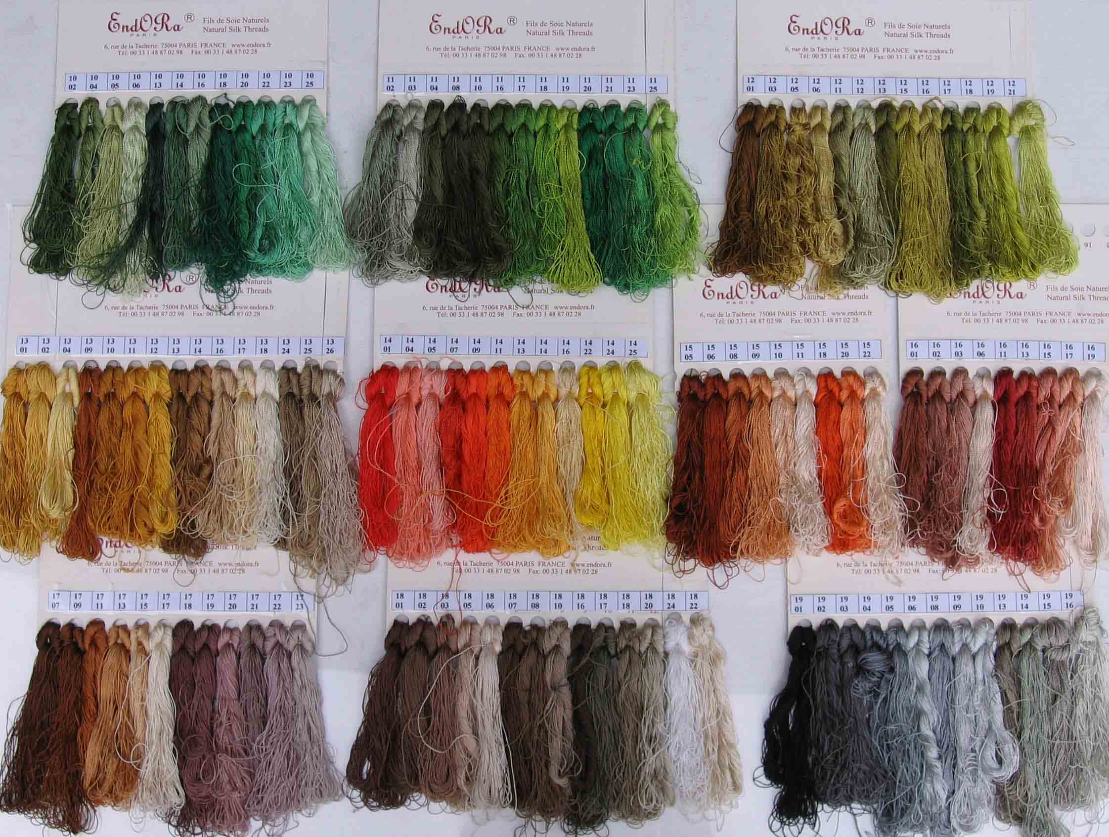 Une gamme complète de fils de soie perlée non divisible (composés de 20 brins torsadés issus des cocons de ver à soie), à utiliser en lieu et place d’un brin de fil de coton mouliné DMC. Plus de 450 couleurs en stock permanent, 2.50 Euros par fil de 24 mètres.